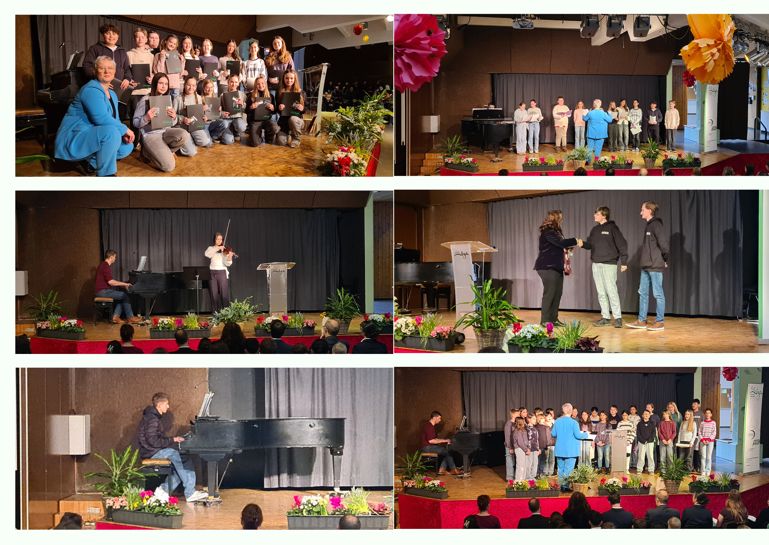 Ein großes Lob für ihr besonderes Engagement sprach Frau Bräunig ihrem Schulchor Viva Voices und dem Vokalensemble aus: "Ihr probt, wenn die Klassenräume am Nachmittag schon leer sind und ihr tretet auf, wenn die Bühne ruft - für die Schule oder die Stadt Altena." Daher bat Frau Bräunig folgende Schüler*innen auf die Bühne: Sophi K. (5a), Jana H. (5c), Liam-Junis Sch., Lilou A., Liva D. (6b), Lara N., Elina O, Edelin Sch. (6c), Mika H. (7a), Danilo T., Ilayda B., Eysan D., Emma M., Greta Sch. (7b) sowie Ella R. und Paula H. (7c).
