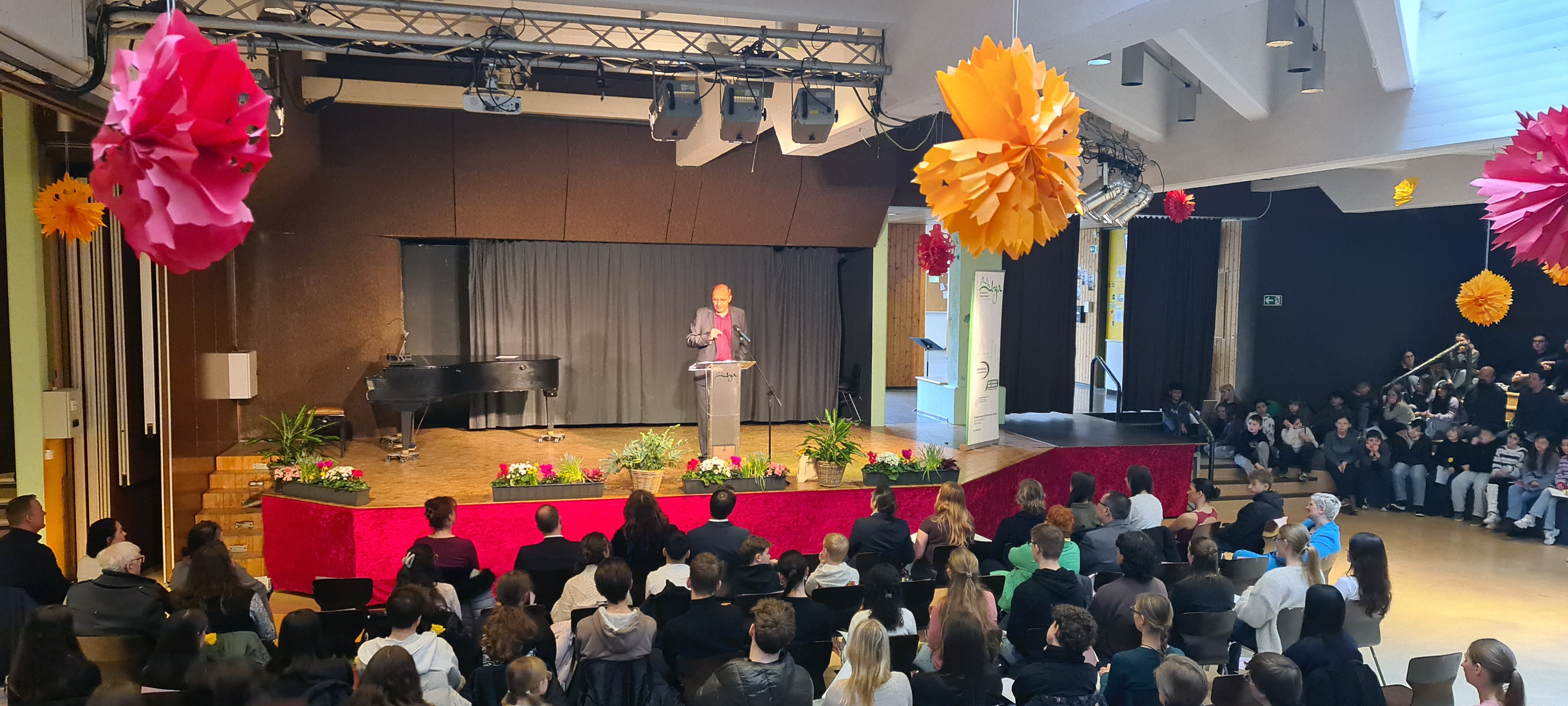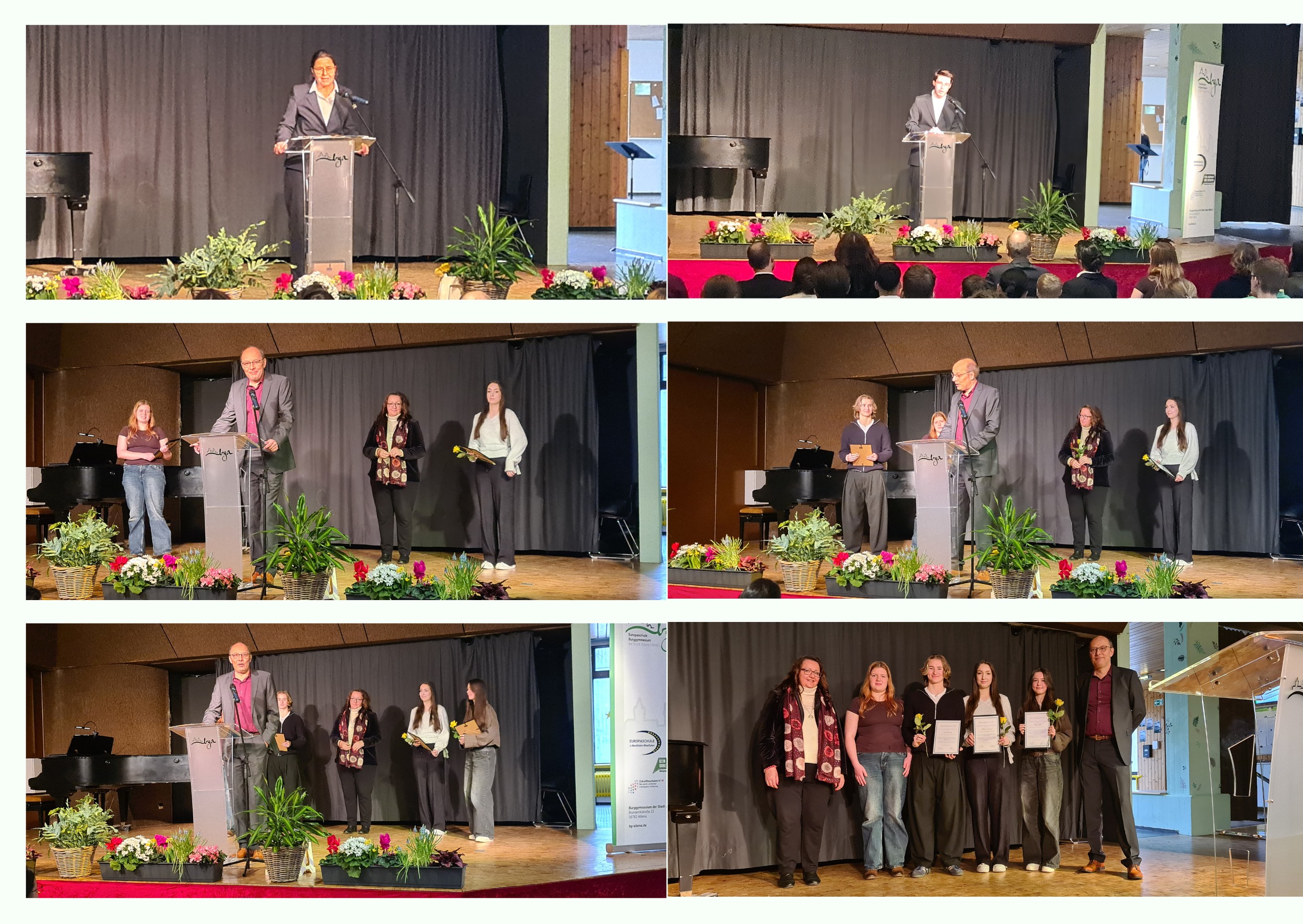 Nach den Grußworten von Frau Reckschmidt (im Namen der Stadt Altena) und Herrn Paul Sprenger (erster Schüler, der 2025 durch die "Stiftung Burggymnasium Altena" geehrt wurde) übernahm der Stiftungsgründer der "Stiftung Burggymnasium Altena", Herr Dirk Scholl, persönlich und zum zweiten Mal die Ehrungen für soziales Engagement als krönenden Abschluss der Ehrungsfeier. Herr Scholl, der bevor er ans Mikrofon trat, bereits viele Worte der Wertschätzung erhalten hatte, vergab seine Ausschüttungen an Mia Hoppe (insbesondere für die Leitung der Schülerzeitung), sowie Melanie Czarny (insbesondere für ihre Orchesterarbeit - 1. Geige) und Pia Schnietz (insbesondere für die Leitung einer Pfadfindergruppe).